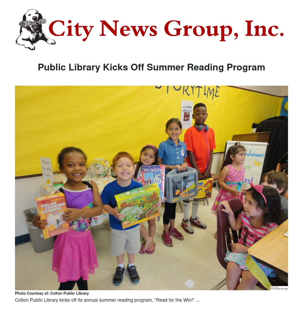 Until Saturday, July 29, people can enjoy the Colton Public Library’s annual summer reading program, “Read for the Win!” Children are welcome to sign up for the summer reading program anytime until July 27. For every five books read, up to 25 books, children 12 and under will receive a prize. All programs are free of charge and open to the public. For more information, please call the main library at 909-370-5083 during regular business hours.