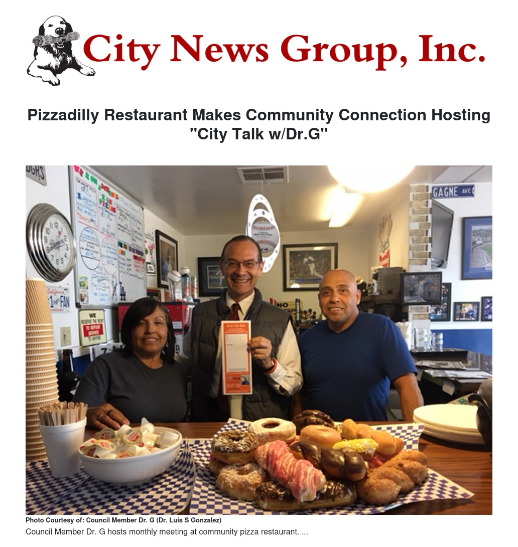 “The owners of Pizzadilly really stepped up by providing the location, and donating refreshments to the meeting attendees,” reported Dr. G. Even though Pizzadilly is open 7 days a week, their normal business hours start at 11:00am, which posed a slight problem for the 9:00am “City Talk” meeting. “They offered to open at 8:30am for the 9:00am meeting,” Dr. G added.