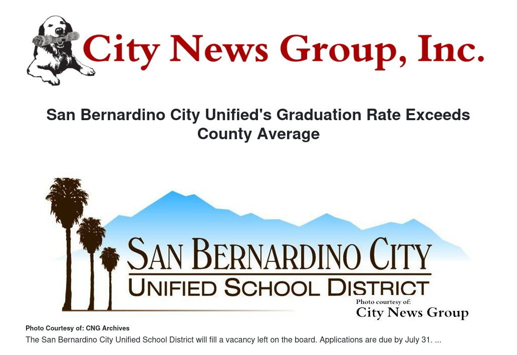 San Bernardino City Unified School District made history by exceeding the San Bernardino County graduation rate for the Class of 2014, with 79.9 percent of students earning a high school diploma, 1.3 percent higher than the county rate of 78.6 percent.