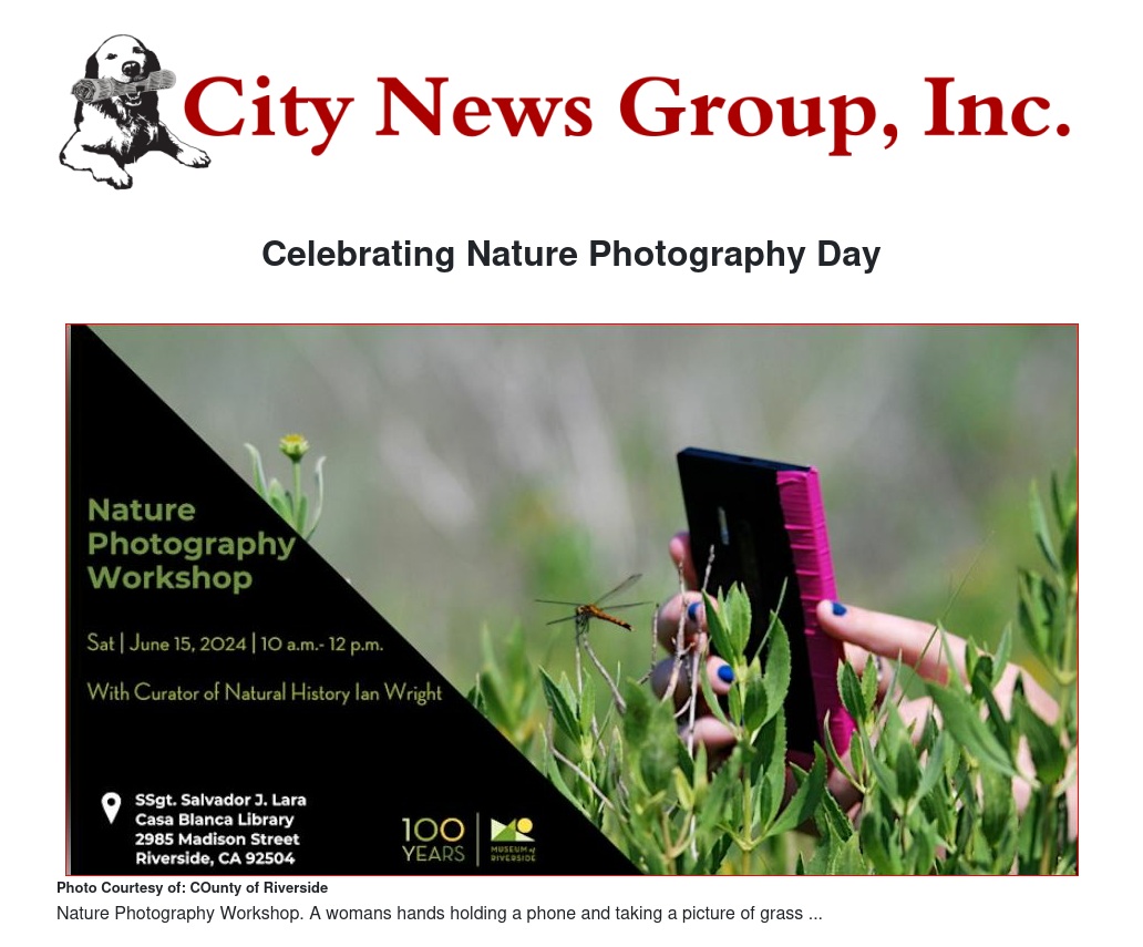 The Museum of Riverside is ready to snap! Come celebrate Nature Photography Day with us on Saturday, June 15, 2024, at the SSgt. Salvador J. Lara Casa Blanca Library (2985 Madison Street, Riverside, CA 92504). Explore the Waterwise Garden and learn nature photography tips from museum staff and partners. Whether you're a professional, amateur, or hiker with a cell phone, we encourage you to snap photos of local wildlife. Our Curator of Natural History, Ian Wright, will discuss how uploading your photos to iNaturalist helps science and conservation. Bring your cameras or phones and have your photography questions answered. This free, family-friendly event welcomes all ages. Drop in anytime between 10 a.m. and noon on Saturday June 15!
