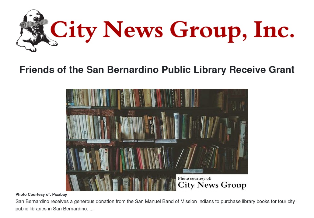 The San Manuel Band of Mission Indians had previously provided a $40,000 donation for library books in November, 2015 to the Friends of the San Bernardino Public Library, Erjavek said.