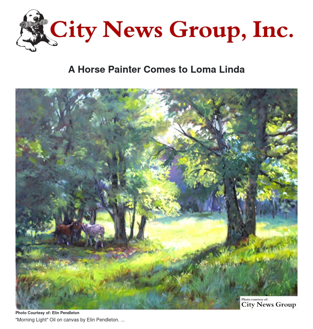 Horse enthusiast and artist Elin Pendleton, AAEA WAOW, will present a demonstration on painting horses in the landscape at the April 12 meeting of the Loma Linda Cultural Arts Association, which will be held from 2 to 4 p.m. at the Loma Linda Senior Center, located in the southeastern corner of the City of Loma Linda civic complex at 25541 Barton Road.