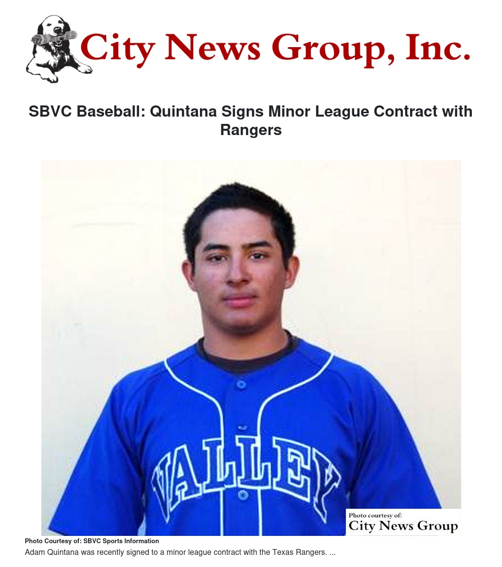 On Aug. 11, former SBVC Baseball first team All-American and former Baseball assistant coach, Adam Quintana (San Bernardino San Gorgonio) was recently signed to a minor league contract, joining the Rookie team for the Arizona League (AZL) Texas Rangers in Surprise, Arizona.