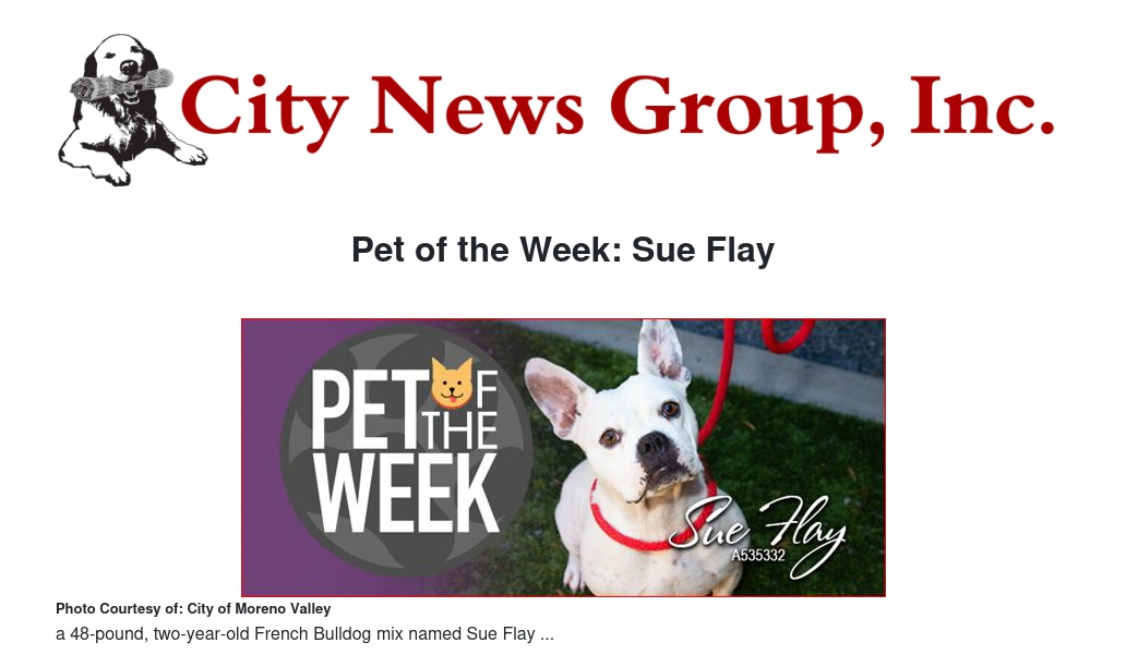 If you would like to make Sue Flay or any pet from the Moreno Valley Animal Shelter part of your family, please contact the Moreno Valley Animal Shelter at 951.413.3790 or visit www.moval.org/pets. |