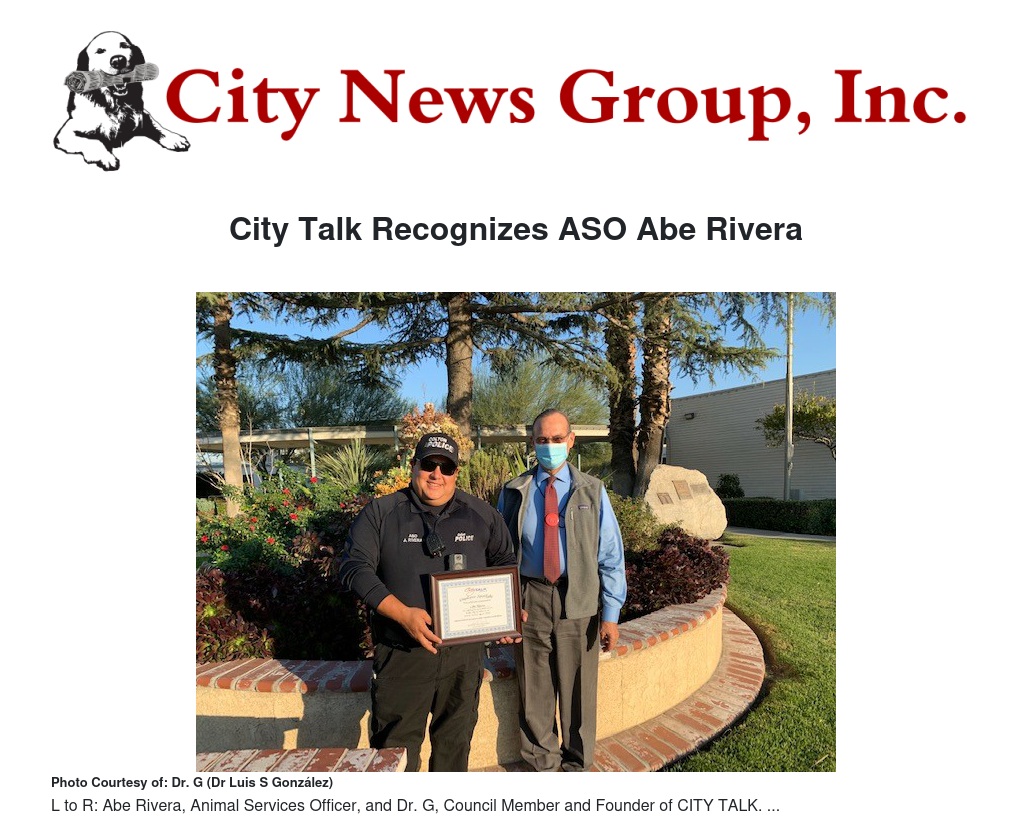 On Thursday, December 2, Council Member Dr. G (Dr. Luis S González) presented the CITY TALK “Employee Spotlight” recognition to Abe Rivera, an eight-year employee of the City of Colton as an Animal Services Officer (ASO).