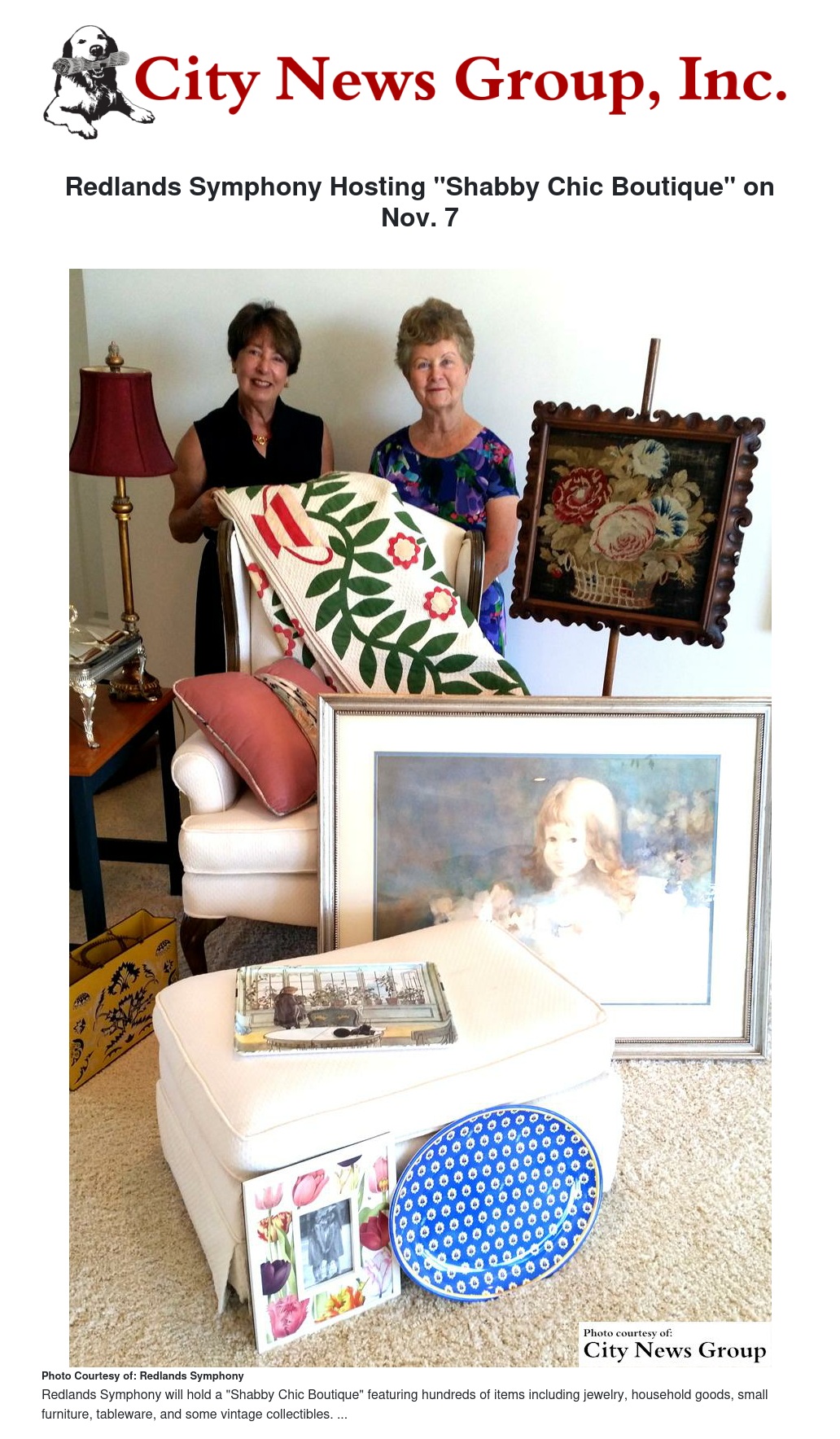 Redlands Symphony will hold a "Shabby Chic Boutique" featuring hundreds of items including jewelry, household goods, small furniture, tableware, and some vintage collectibles on Saturday, Nov. 7, from 8 a.m. to 1 p.m. at the future home of the Redlands Historical Museum, located at 700 Brookside Avenue in Redlands.