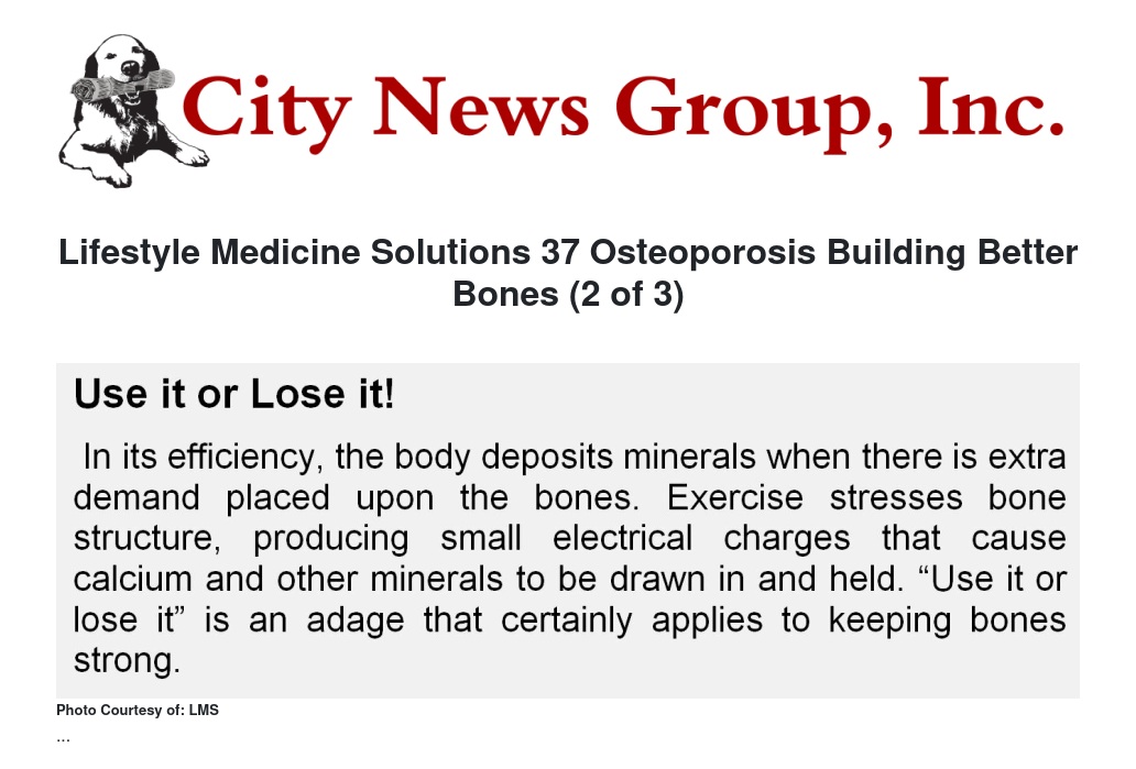 REVIEW: In our last health column we defined osteoporosis, discussed its risk factors and offered several treatments, such as Estrogen Therapy, Vitamin D, Calcium, and Exercise.
