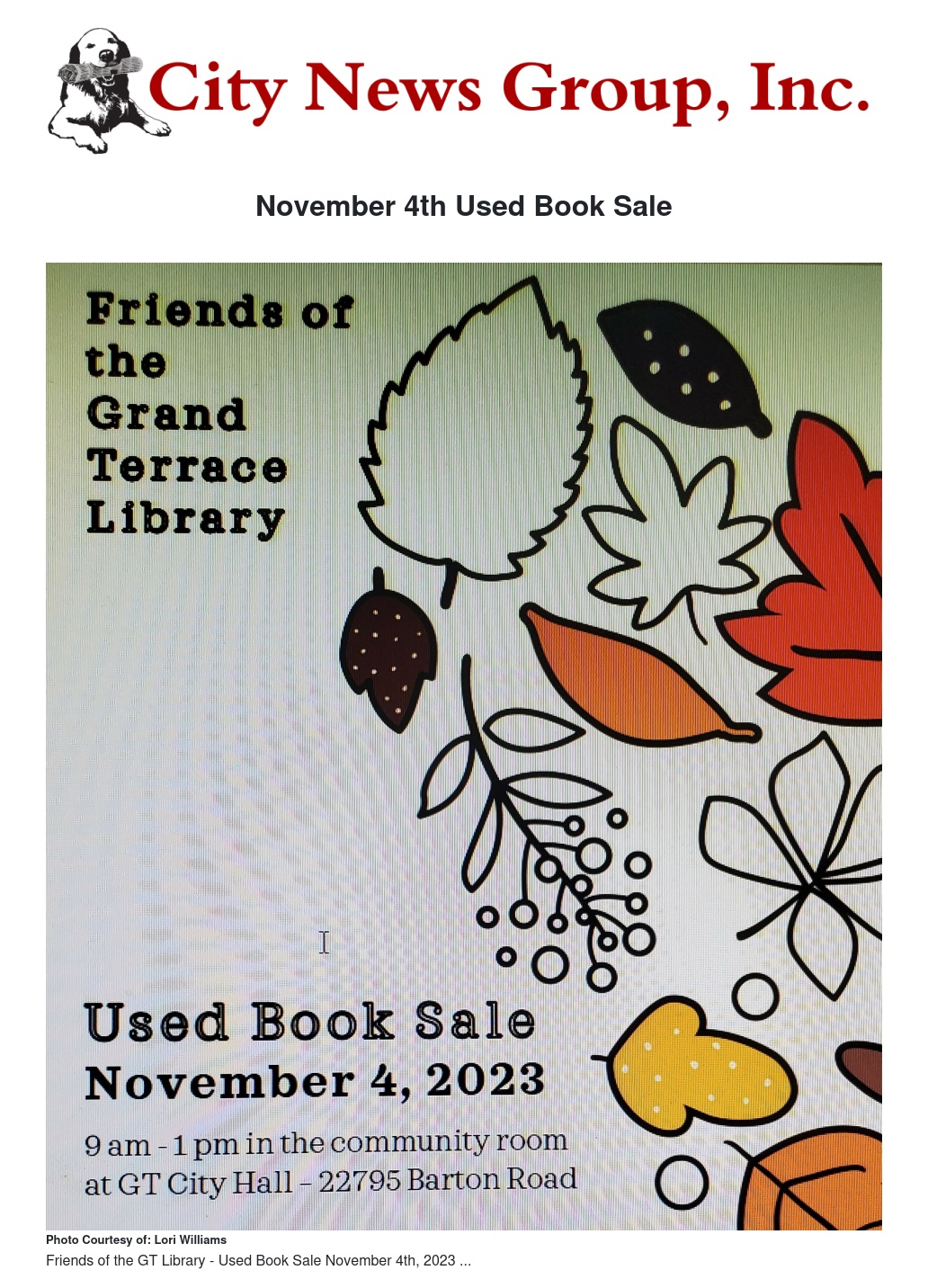 Grand Terrace City Hall – Community Room, 22795 Barton Road, Grand Terrace, on November 4th, 2023, from 9 am to 1 pm. Get there EARLY for the best selection!