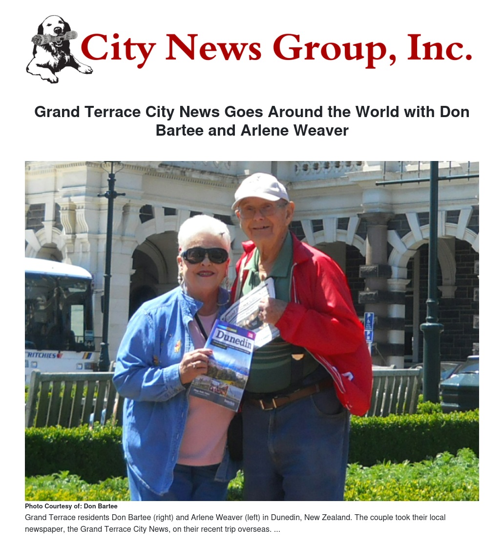 Longtime Grand Terrace residents Don Bartee and Arlene Weaver took their Nov. 21, 2013 edition of their hometown's community newspaper with them on their cruise trip to Australia and New Zealand.