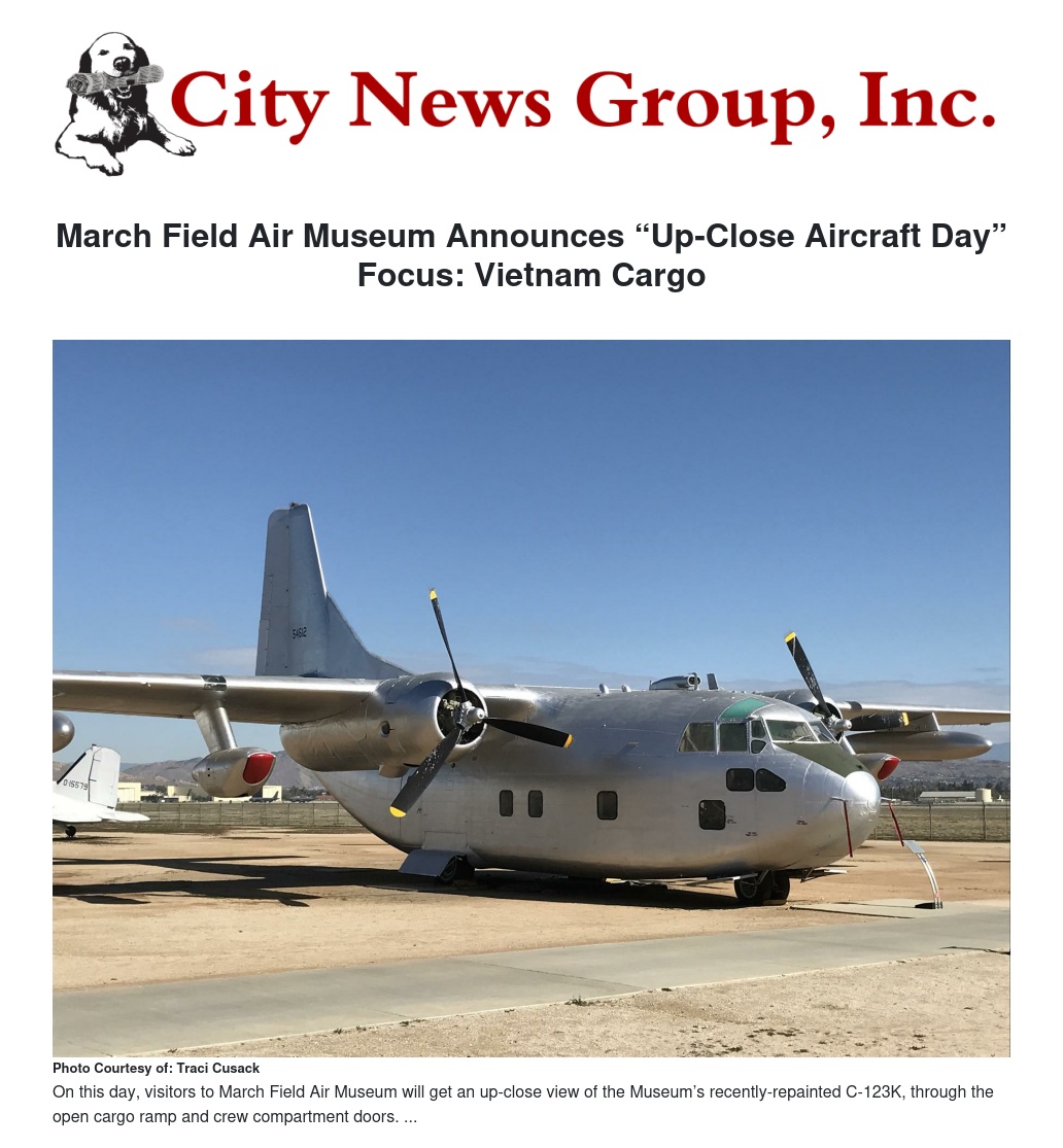 March Field Air Museum is proud to announce the fourth installment of “Up-Close Aircraft Days” on Saturday, April 14, 2018, from 11 a.m. to 3 p.m. As part of the interpretive new program, a different aircraft is featured each month with the next focused on the Fairfield C-123K Provider. On the second Saturday of each month throughout the year, Museum guests will have the opportunity for a close-up look – sometimes climbing stairs to get a close-up view into the cargo bay or cockpit, other times even climbing aboard.