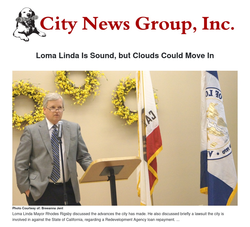 Loma Linda Mayor Rhodes Rigsby shared that Loma Linda is a sound city but could face financial difficulties ahead. “The City of Loma Linda has, this year, shown that they are a very strong city, and every strong city has that silver lining but with every silver lining there is a cloud,” he said. Rigsby was hinting at the possible outcome of the City’s decision to sue the State of California over the state’s demand that Loma Linda immediately pay in full the $15 million loan the city took out from the Redevelopment Agency (RDA) before the RDA’s dissolution, which he elaborated on later in his speech.