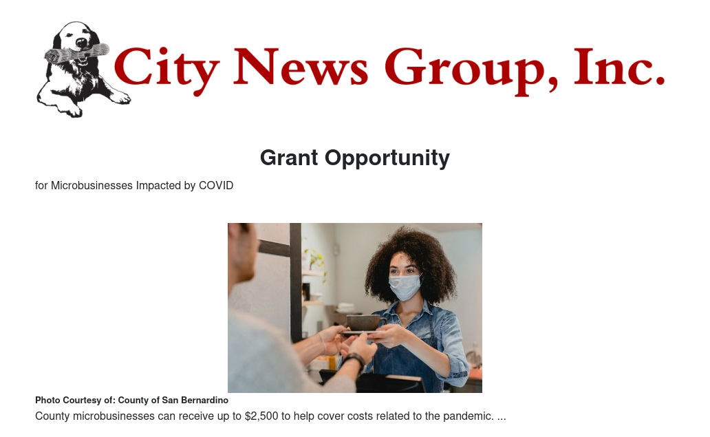 Eligible San Bernardino County microbusinesses that were adversely impacted by the COVID-19 pandemic can apply for $2,500 grants to help defray losses and cover pandemic-related expenses.