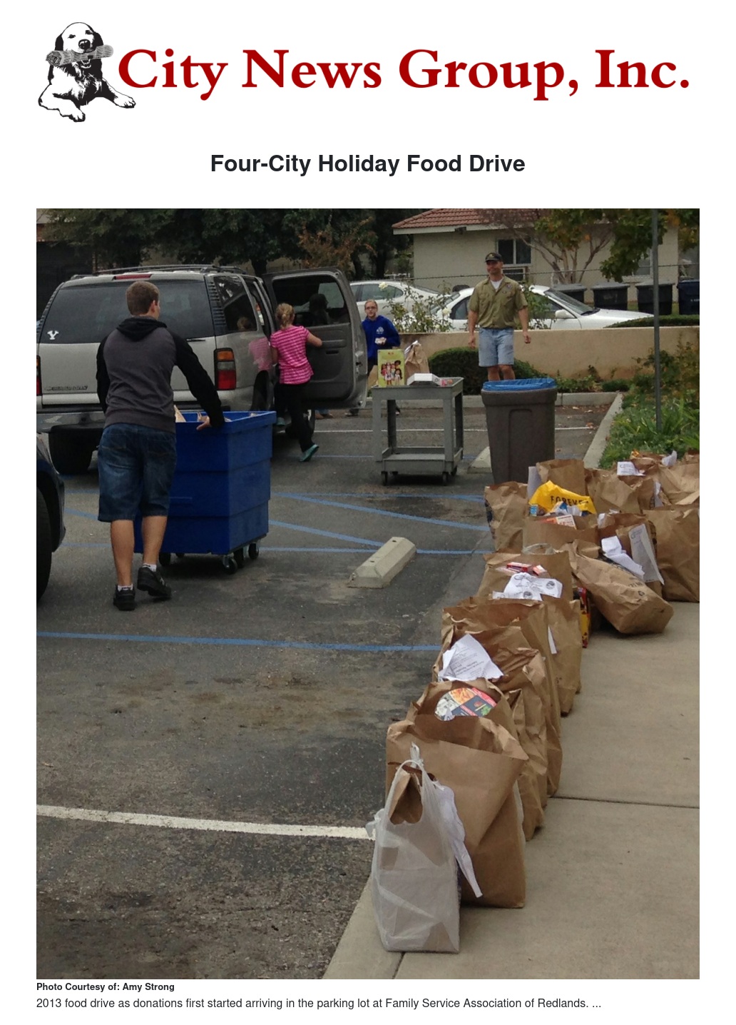 To participate in this drive, look for brown bags delivered to your door on Nov. 8, or take donations directly to Family Service Association of Redlands located at 612 Lawton St. in Redlands.