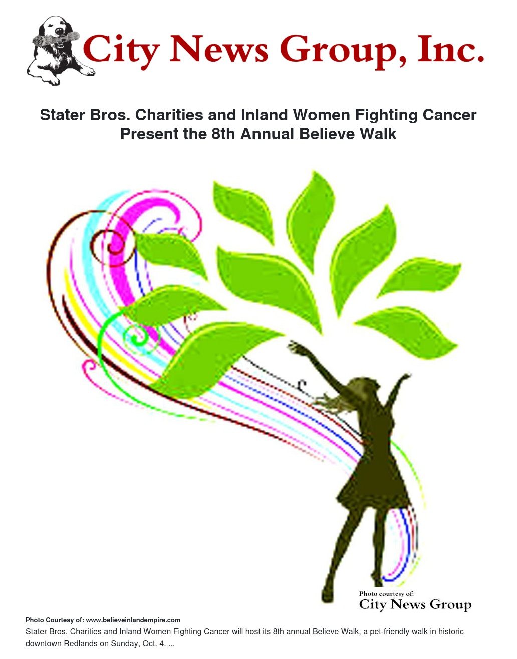 Stater Bros. Charities and Inland Women Fighting Cancer will host its 8th annual Believe Walk, a pet-friendly walk in historic downtown Redlands on Sunday, Oct. 4.