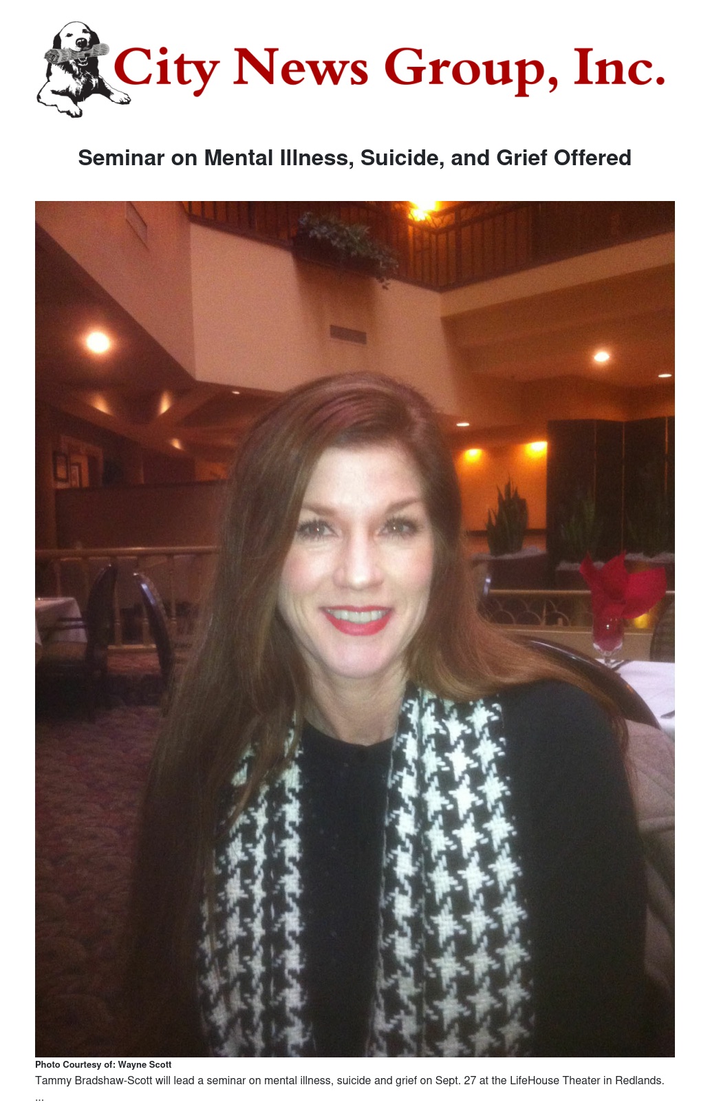 "Mental Illness, Suicide and Grieving the Loss of a Loved One" is the title of a new seminar to be conducted by Tammy Bradshaw-Scott on Saturday morning, Sept. 27 in Redlands.