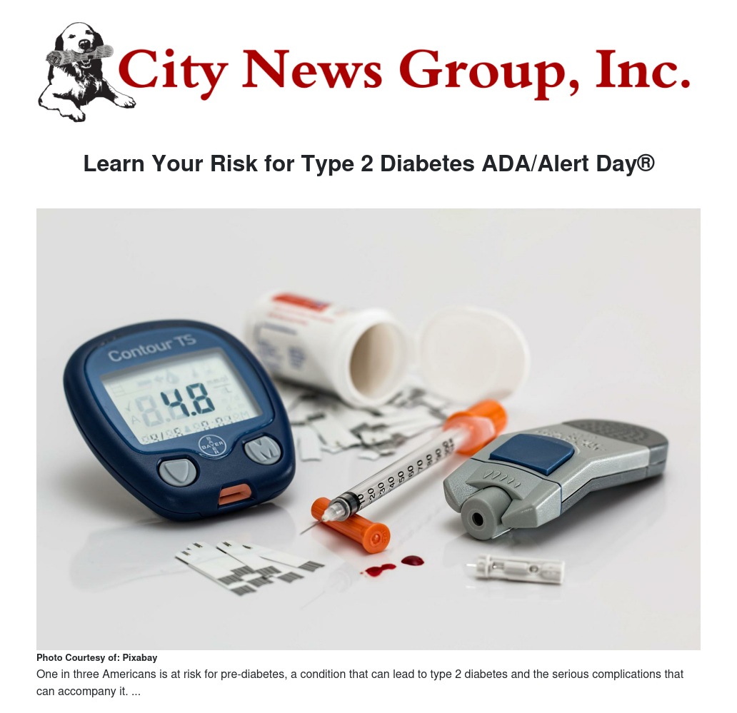 American Diabetes Association’s (ADA’s) annual Alert Day, an opportunity to sound the alarm about the prevalence and risks of type 2 diabetes by asking Americans to take the Type 2 Diabetes Risk Test. The free, anonymous risk test is available online at diabetes.org/alertday or via a printable questionnaire in English and in Spanish, and only takes a minute to complete. By answering questions such as “Do you have a family history of diabetes?” and “Are you physically active?” participants can learn if they’re at risk for developing type 2 diabetes in just 60 seconds.