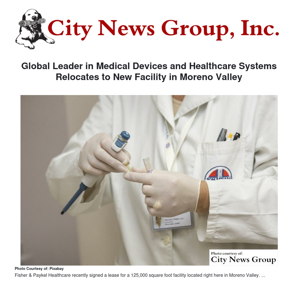 MORENO VALLEY >> The City of Moreno Valley welcomes Fisher & Paykel Healthcare, global leader in medical devices and healthcare systems. Fisher & Paykel recently signed a lease for a 125,000-square-foot facility located at 24950 Grove View Road in Moreno Valley.
