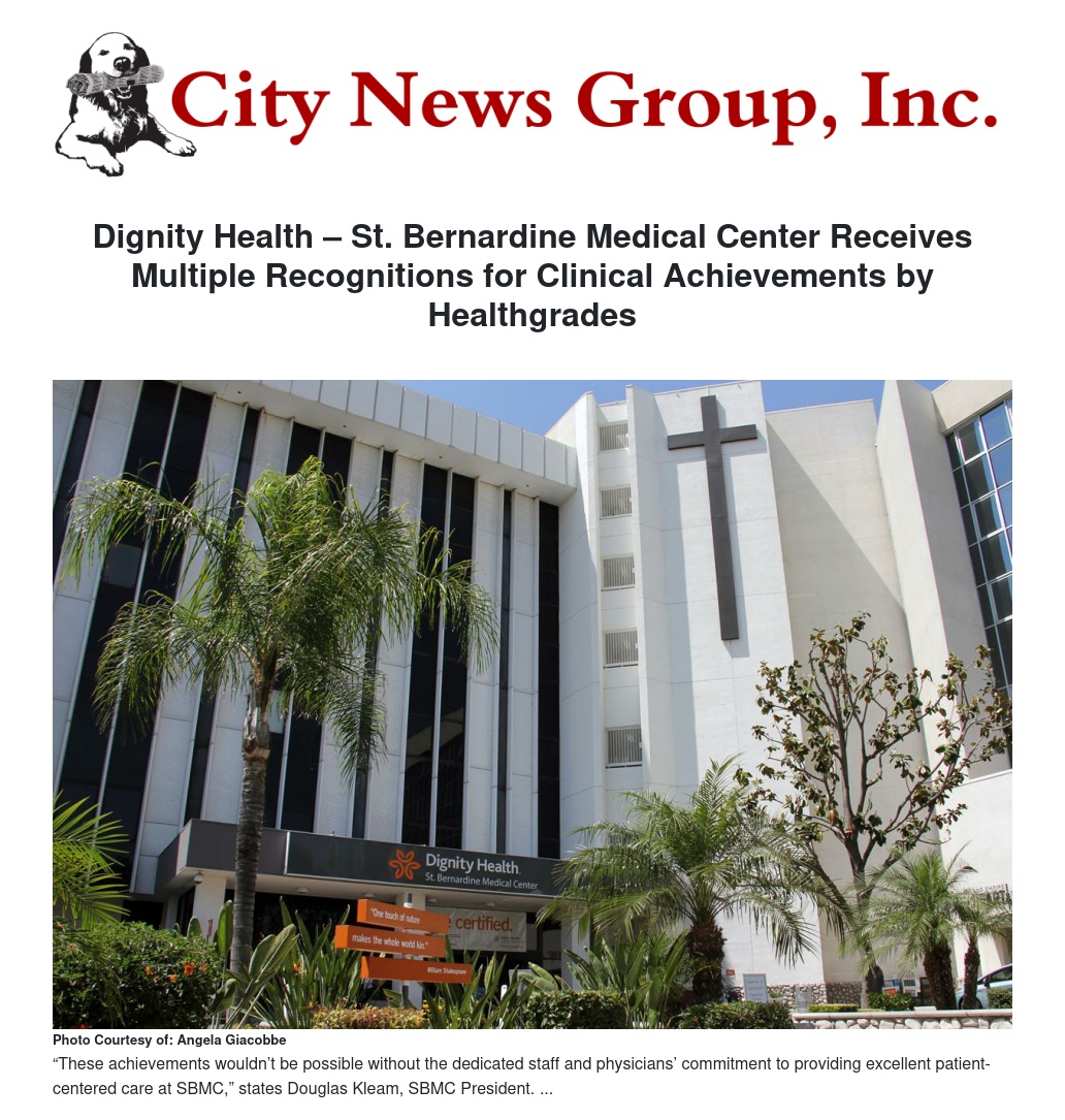 Dignity Health – St. Bernardine Medical Center Receives Multiple Recognitions for Clinical Achievements by Healthgrades by Angela Giacobbe - City News Group, Inc.