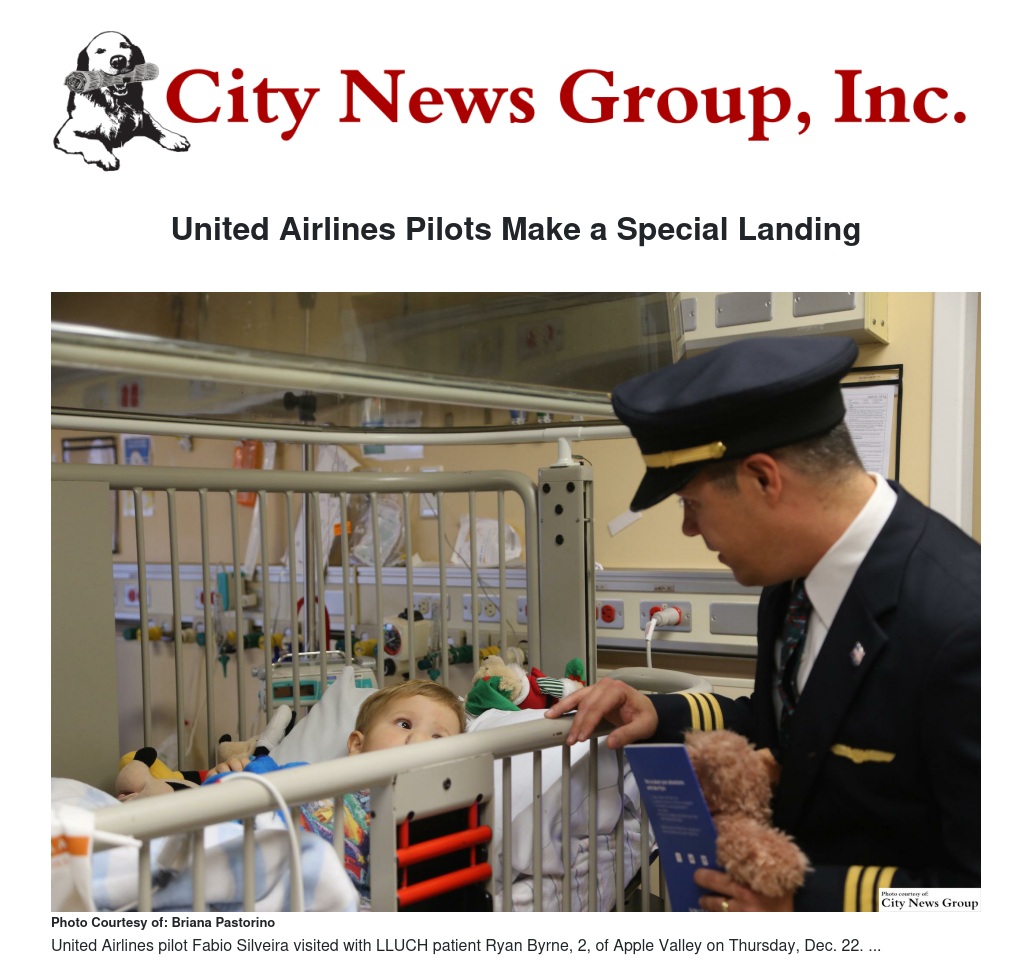 LOMA LINDA>> Some United Airlines pilots made a special landing at Loma Linda University Children’s Hospital last month. The pilots visited with patients Thursday, Dec. 22 as part of their Adventure Bear program, which supports children’s hospitals throughout the United States.