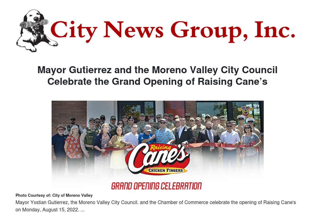 Mayor Yxstian Gutierrez, the Moreno Valley City Council, and the Chamber of Commerce celebrated the grand opening of Raising Cane’s on Monday, August 15, 2022.