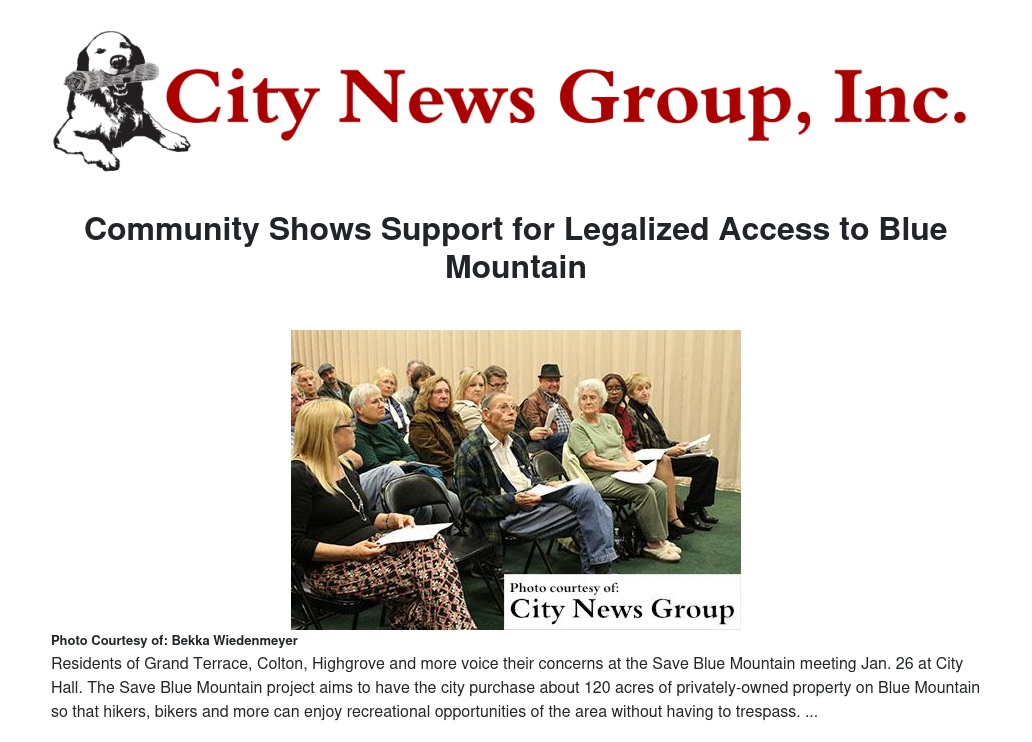 Residents of Grand Terrace, Colton, Highgrove and surrounding communities joined together at Grand Terrace City Hall on Jan. 25 to discuss future plans regarding the Blue Mountain Nature Trail project.