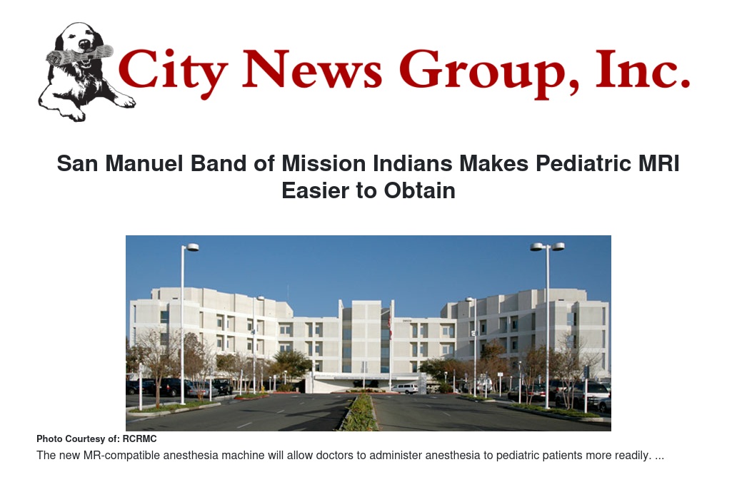 The San Manuel Band of Mission Indians has teamed with the RCRMC (Riverside County Regional Medical Center) Foundation to provide the nonprofit trauma center with an MRI-compatible anesthesia machine. The $160,000 device allows doctors to administer anesthesia to pediatric patients and more readily obtain MRI images on-site, rather than sending the patients to other hospitals to complete the study. San Manuel contributed $20,000 to assist with the equipment purchase by the Foundation, which used funding from its popular Festival of Trees annual fundraiser.