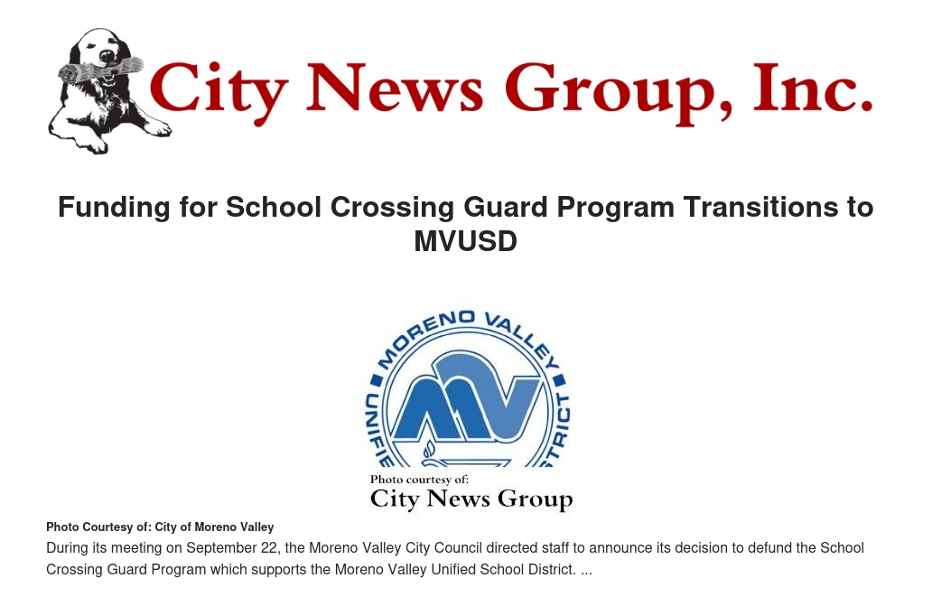During its meeting on September 22, the Moreno Valley City Council directed staff to announce its decision to defund the School Crossing Guard Program which supports the Moreno Valley Unified School District.