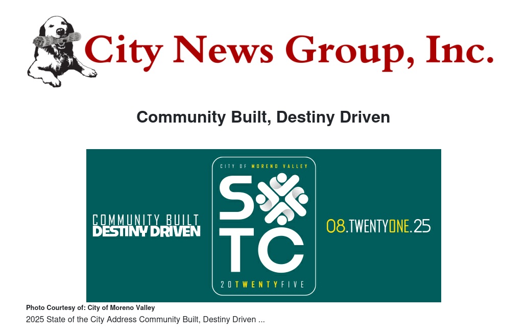 On Thursday, August 21, Mayor Ulises Cabrera and the Moreno Valley City Council will welcome residents, business leaders, local dignitaries, and community stakeholders for the 2025 State of the City Address. This year's event highlights a City that is COMMUNITY BUILT, DESTINY DRIVEN.