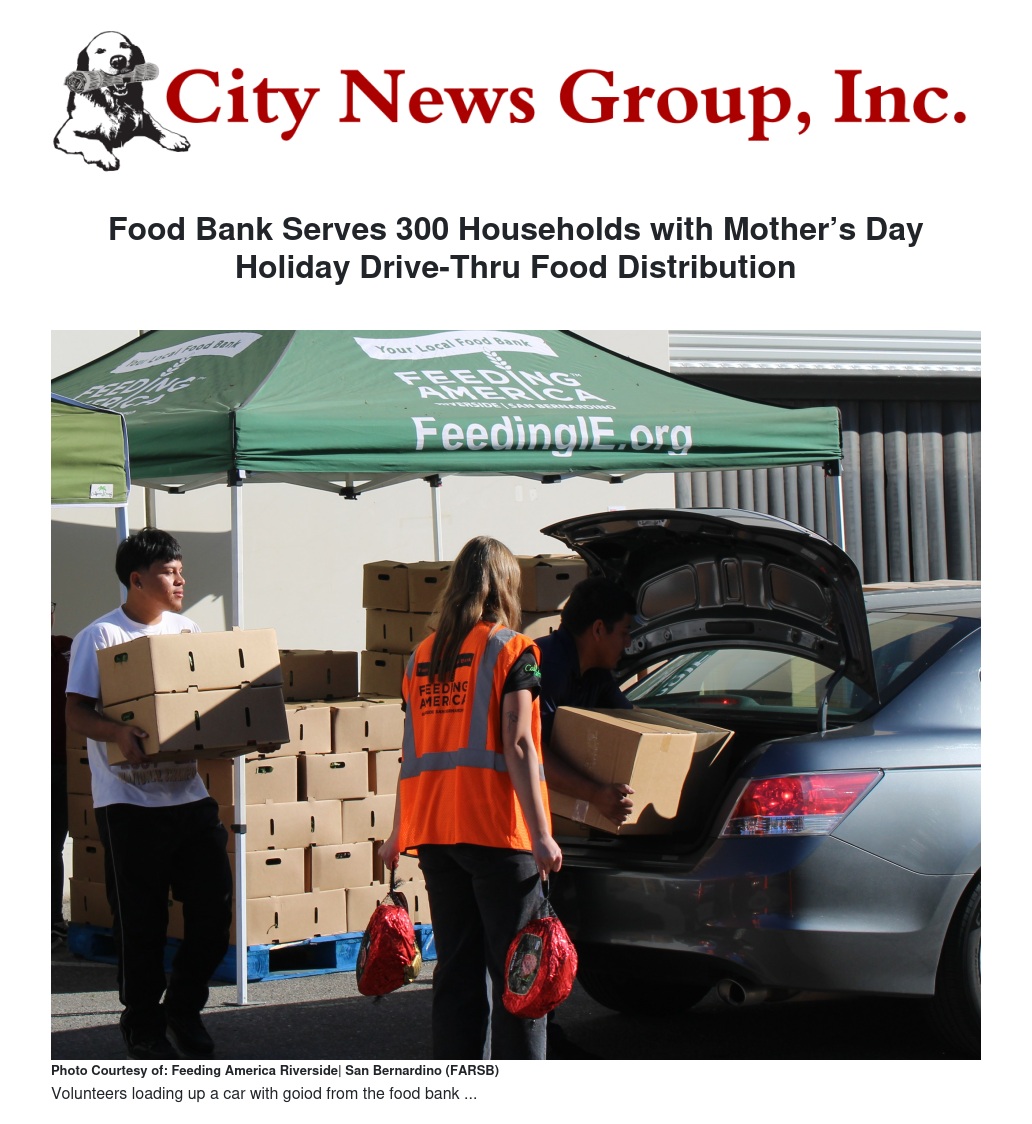 In honor of Mother’s Day, Feeding America Riverside | San Bernardino (FARSB) held a special drive-thru food distribution at its Riverside warehouse, providing critical nutrition support to families facing food insecurity. During the two-hour event, FARSB served approximately 300 households, distributing shelf-stable food boxes, fresh produce, and whole hams to help make the holiday weekend brighter for local mothers and their families.