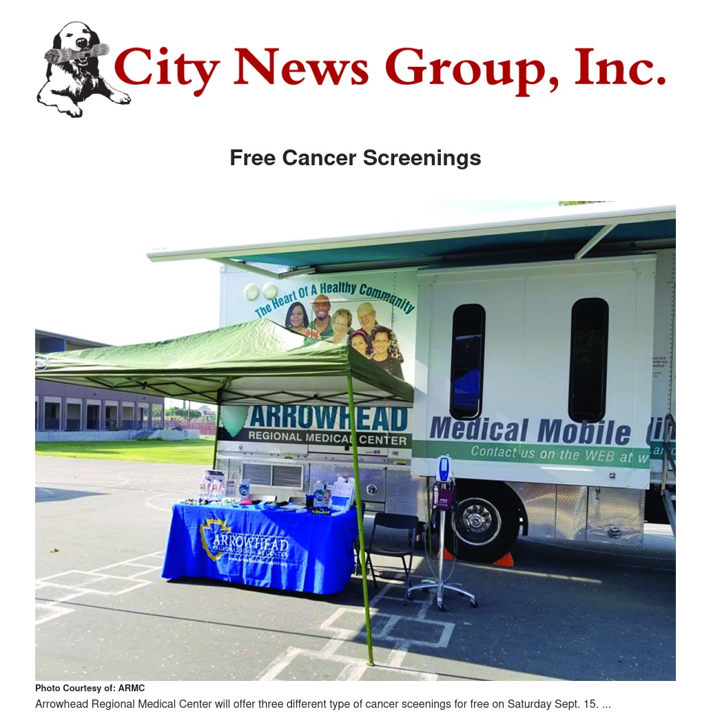 Arrowhead Regional Medical Center (ARMC) is offering free screenings for breast, colorectal and cervical cancers on Saturday, Sept. 15. Registration begins at 8:30 a.m., with screenings beginning at 9 a.m. and concluding at 1 p.m. Attendees are encouraged to come early, as only the first 200 registrants can be screened.