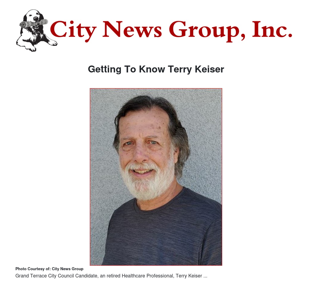 I’m Terry Keiser, and I’m running for Grand Terrace City Council because I believe in this community and its future. As a 69-year-old retired physical therapist and a small business owner, I’ve spent my life working to help others regain their health and independence. Now, I want to use that same dedication to help our city thrive.