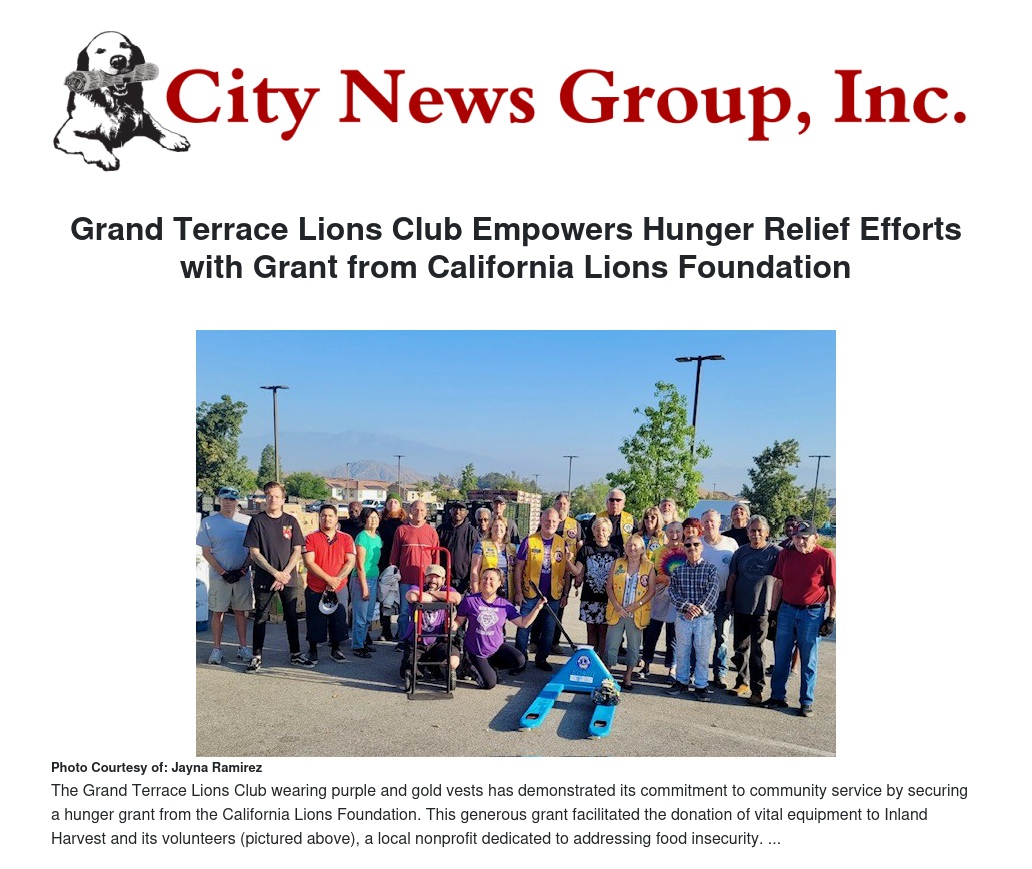 The Grand Terrace Lions Club would like to extend heartfelt thanks to the California Lions Foundation for their support through this grant. The Lions Club also commends the dedication and hard work of the Inland Harvest volunteers, whose efforts are crucial in the fight against hunger
