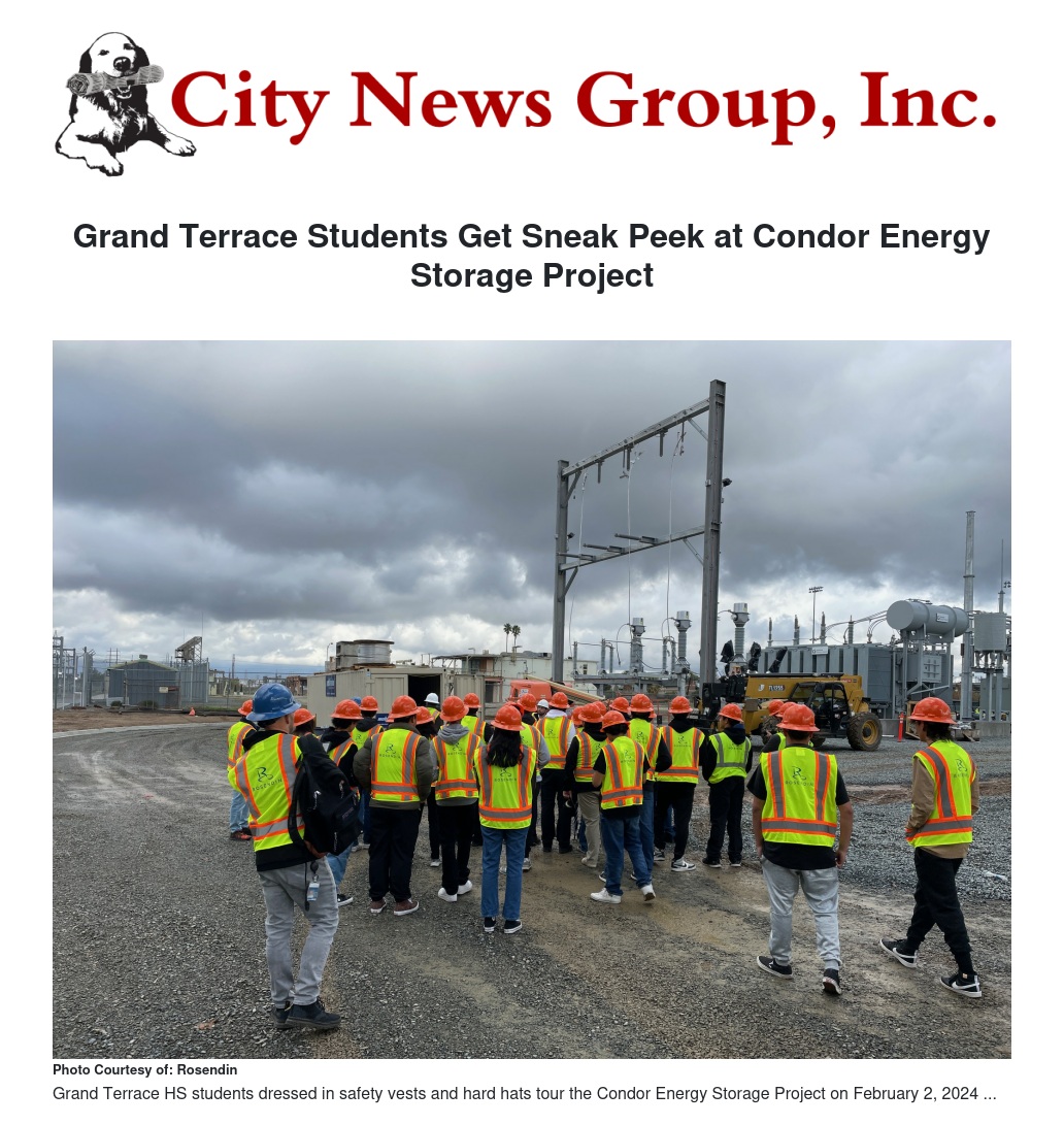 Dozens of students from Grand Terrace High School got a rare look inside Arevon’s 200 megawatt (MW)/800 MWh Condor Energy Storage Project during a field trip to learn how battery energy storage systems work. The opportunity to tour the facility came by invitation from the builder, Rosendin Renewable Energy Group (RREG), a California company and one of the largest Renewable Energy General Contractors in the U.S.