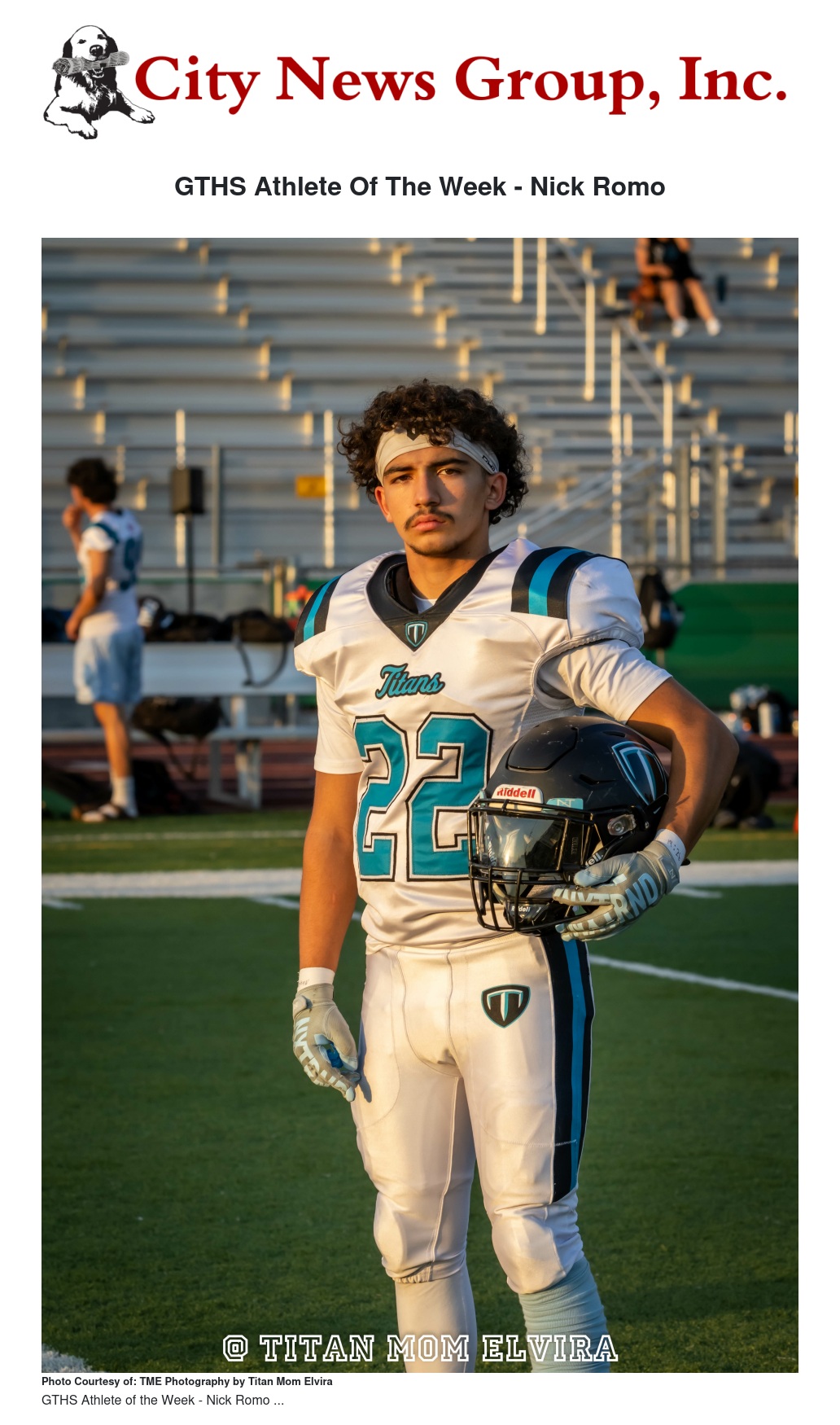 Some of Nick’s notable achievements include earning an academic letter, being selected as Vice President for GTHS ASB, maintaining honor roll status since his freshman year, and making the Varsity football team during his first year of high school.