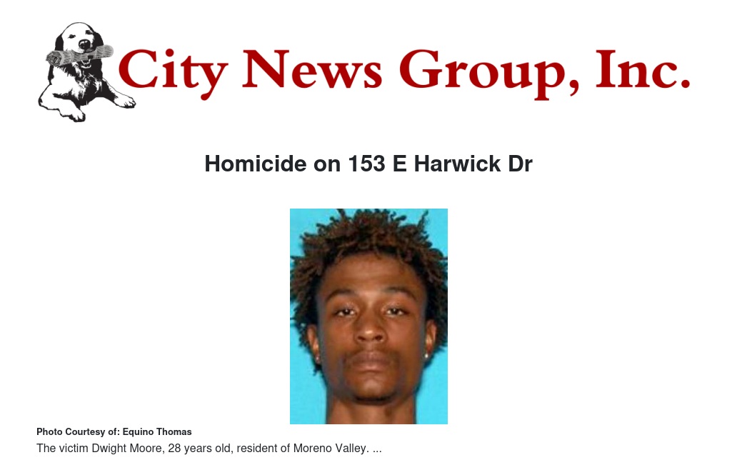 On February 12, 2022, at approximately 7:41 pm, the San Bernardino Police Call Center received multiple 911 calls regarding a shooting that had occurred at 153 E. Harwick Drive (Colony Park). Patrol officers were dispatched and found the victim, Moore, a short distance away suffering from multiple gunshot wounds. Moore was pronounced deceased at the scene. Homicide detectives responded and conducted an investigation.