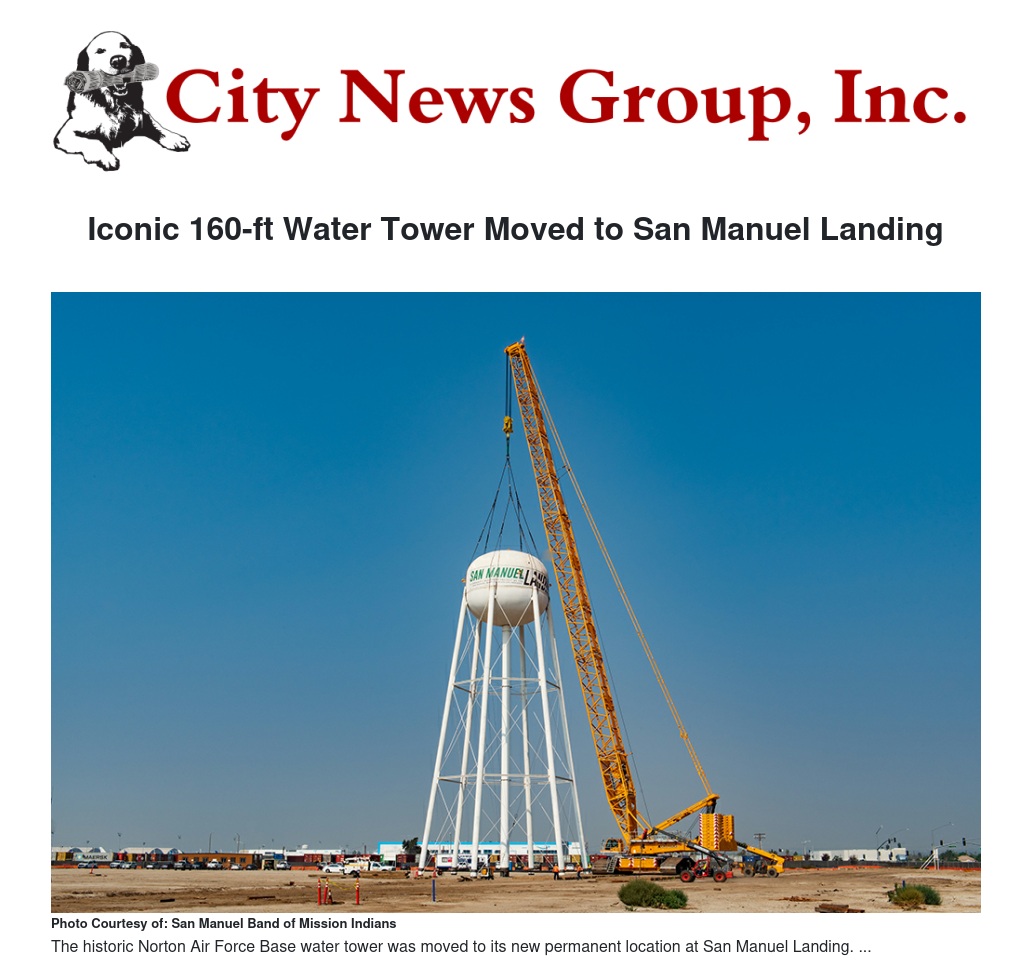 The historic and iconic Norton Air Force Base water tower, a long-standing San Bernardino landmark, was lifted in one complete piece the morning of Tuesday, August 24, 2021, and installed that same afternoon at its new permanent location at San Manuel Landing at the southeast corner of Victoria Avenue and 3rd Street in San Bernardino, CA. Built in 1959 by the U.S. Air Force at Norton Air Force Base, the 160-foot tower provided the base’s water supply.