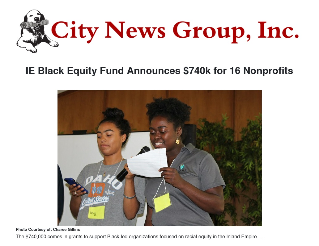 Inland Empire Community Foundation (IECF) and the Black Equity Initiative of the Inland Empire (BEI-IE) announced $740,000 to 16 nonprofits in the first round of grants from the IE Black Equity Fund. These grants will provide resources and capacity-building support to Black-led organizations working to end systemic racism as well as building economic and political power for the Black Community. Individual grants ranged from $15,000 to $80,000.