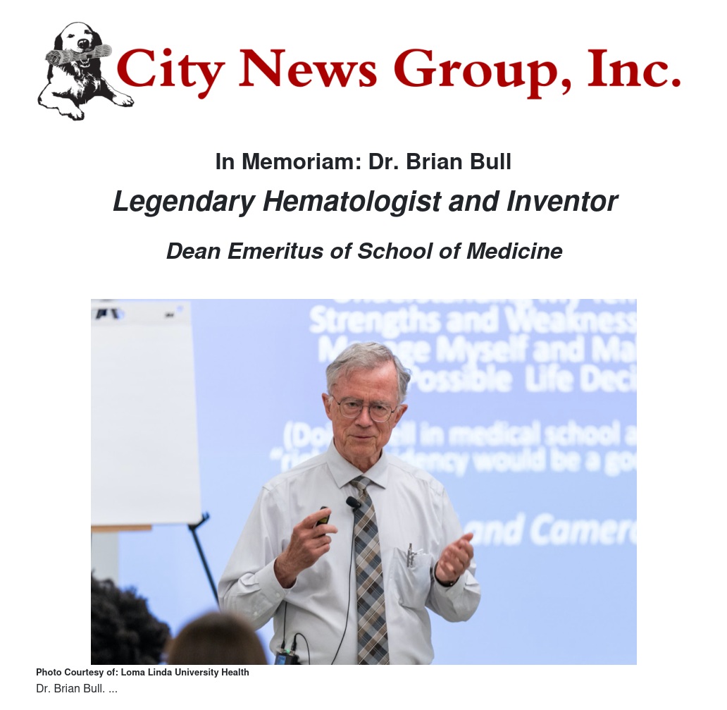Brian Bull, MD, an inventor and one of the world’s leading experts on hematology, who served as dean of Loma Linda University School of Medicine for a decade starting in the 1990s, died February 22. He was 84 and had been diagnosed with cancer.