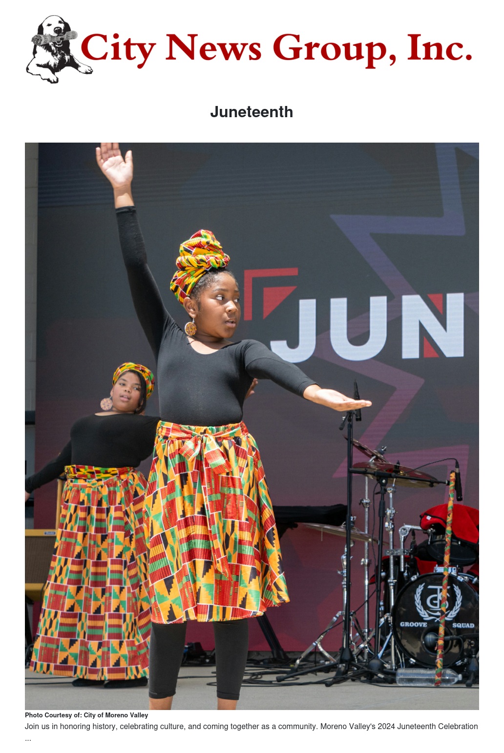 This year, Moreno Valley is proud to host our annual Juneteenth Celebration on Saturday, June 21, from 4 to 8 p.m. at the Civic Center Amphitheater. Join us for an afternoon filled with live entertainment, children’s activities, delicious food, and a vibrant showcase of local artists and vendors. It’s a wonderful opportunity to honor history, celebrate culture, and come together as one community.