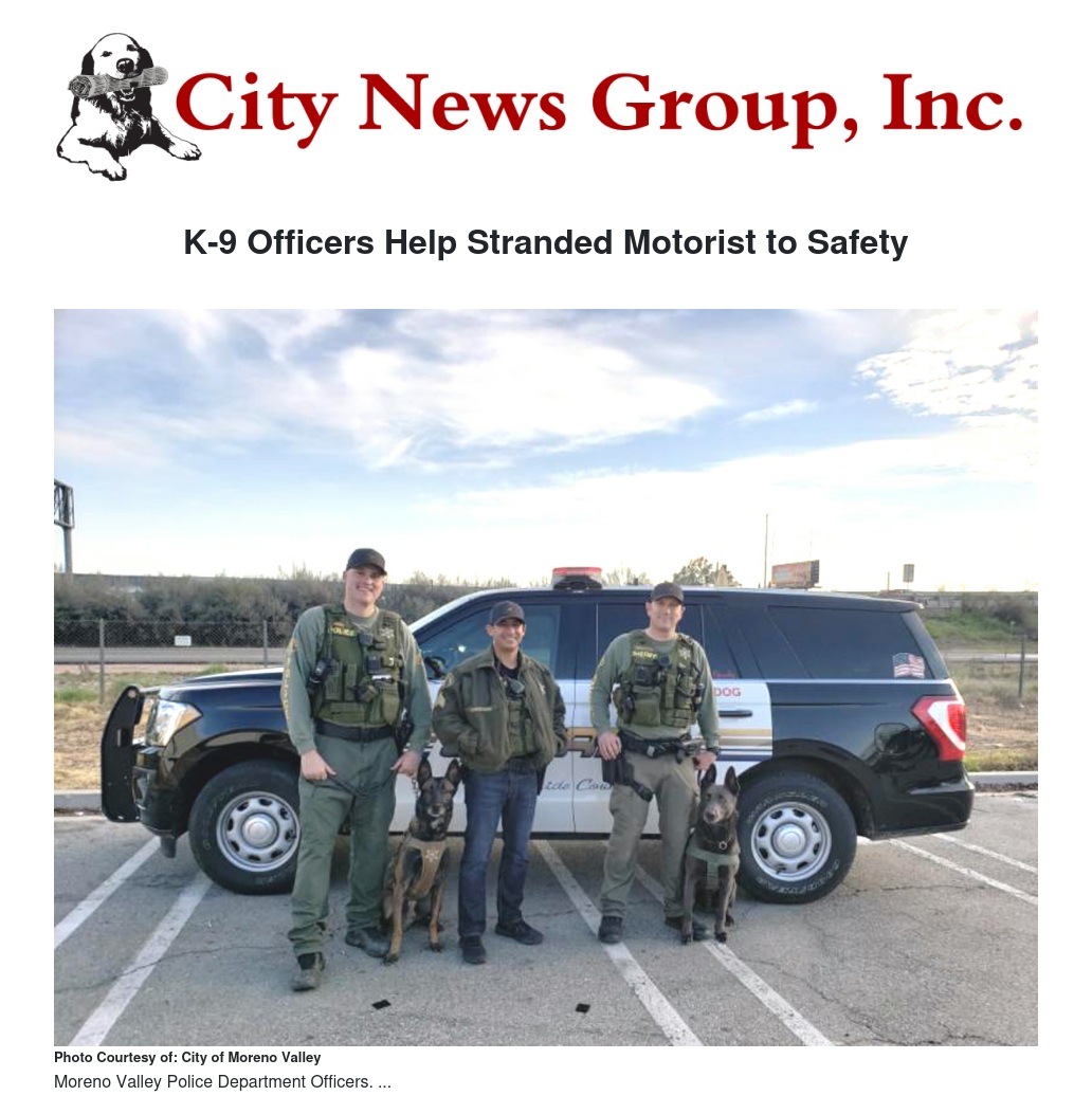 Moreno Valley Police K-9 handler Kory Murphy was on his way to training earlier today with two other K-9 officers when they saw a woman stranded in a disabled car in the middle of the road.