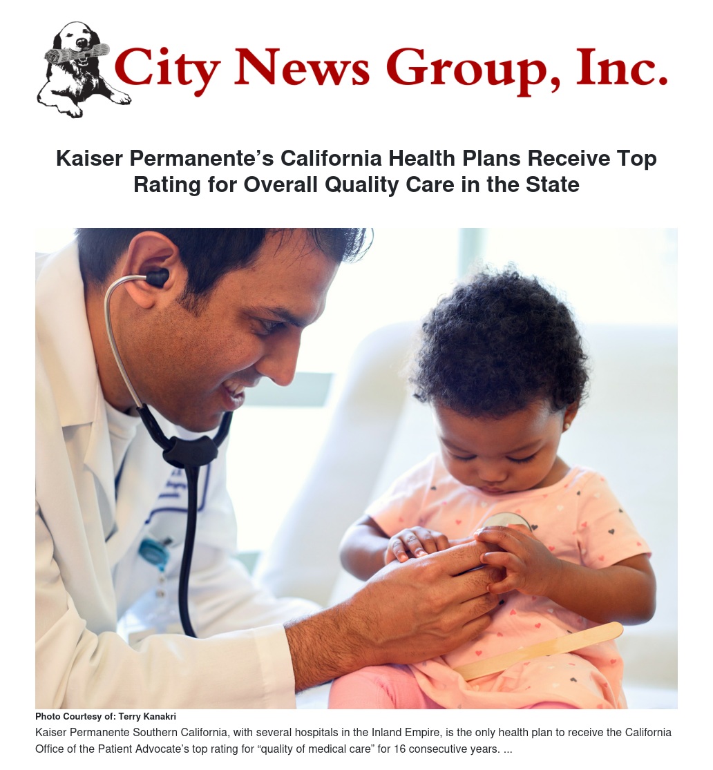 Kaiser Permanente’s California Health Plans Receive Top Rating for Overall Quality Care in the State by Terry Kanakri - City News Group, Inc.