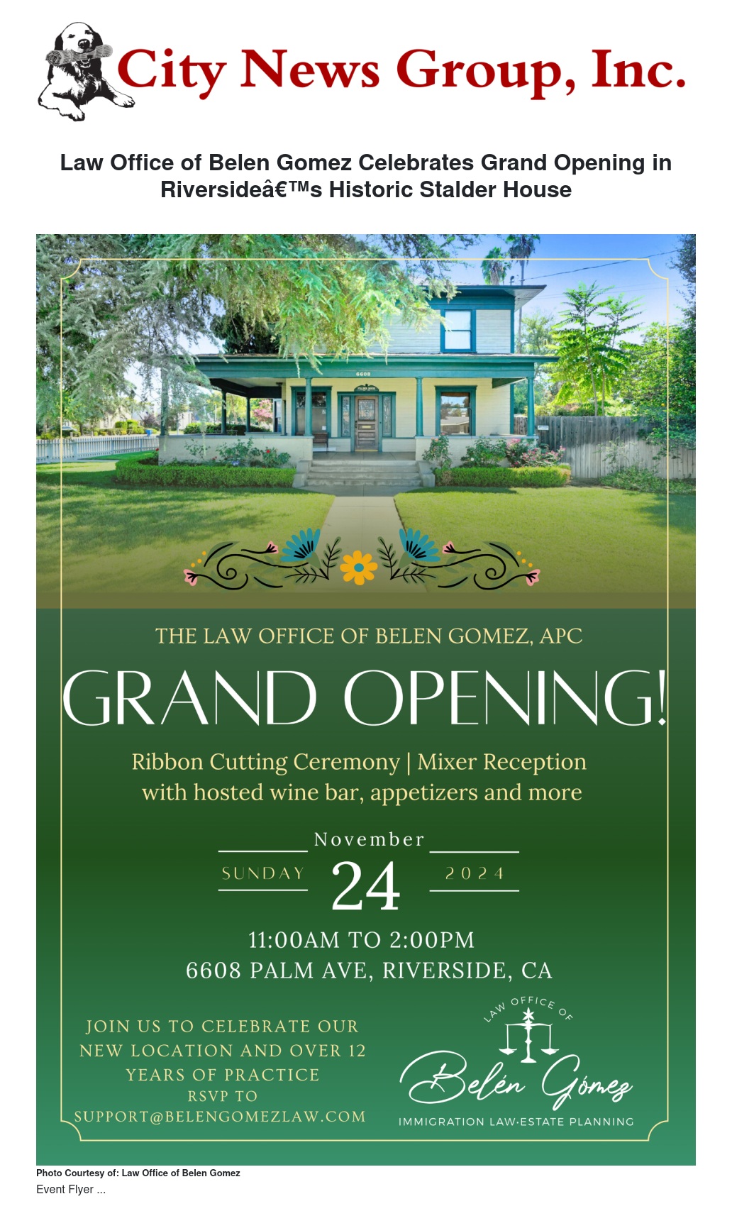 The Law Office of Belen Gomez proudly announces the grand opening of its new office, located in the historic Stalder House at 6608 Palm Avenue, Riverside, CA. The celebration will take place on Sunday, November 24, 2024, from 11 AM to 2 PM, offering a unique blend of tradition and progress as the firm opens its doors in this Riverside landmark.