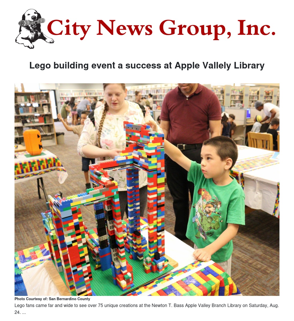 Lego fans came far and wide to see over 75 unique creations at the Newton T. Bass Apple Valley Branch Library on Saturday, Aug. 24. The San Bernardino County Library (SBCL) encouraged patrons of all ages to participate in a special contest to build their own one-of-a-kind Lego creation.