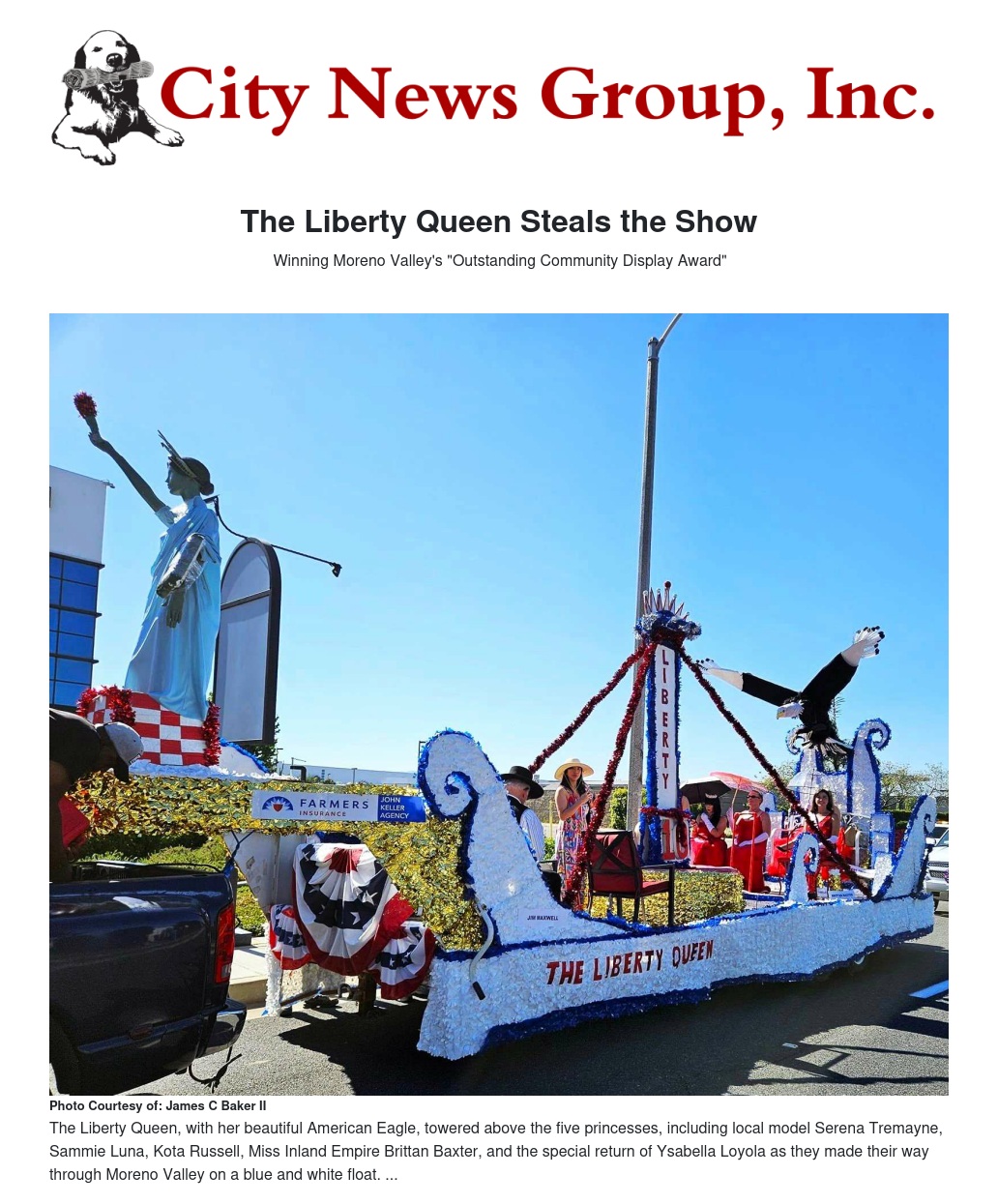 Riding alongside the princesses were Jim Maxwell, dressed as Marshal Wyatt Earp to ensure security, Superior Court Judge Mark Johnson and his wife, and the distinguished Riverside District Attorney, Mike Hestrin. The float, sponsored by FARMERS INSURANCE and the John Keller Agency, as well as Christen Irving of the Black Rose Foundation, showcased three main focal points: Lady Liberty, a towering crowned centerpiece, and an animated bald eagle that bobbed its head in acknowledgment of the cheering crowd.