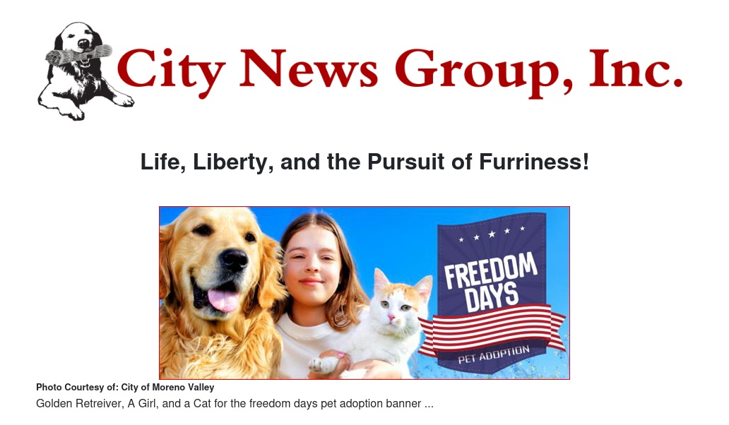 The Moreno Valley Animal Shelter will hold its Annual "Freedom Days" Pet Adoption promotion from Tuesday, July 9 to Saturday, July 13, at the Moreno Valley Animal Shelter. Featuring discounted adoption rates, this special event will run from 10:00 a.m. to 5:00 p.m. on Tuesday through Friday, then on Saturday from 10:00 a.m. to 3:00 p.m.