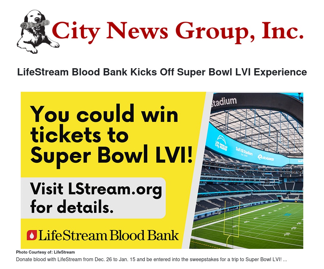 Donors who give blood with LifeStream Dec. 26, 2021 – Jan. 15, 2022, will automatically be entered into the sweepstakes for a chance to win a trip to Super Bowl LVI. Three lucky donors will each win: