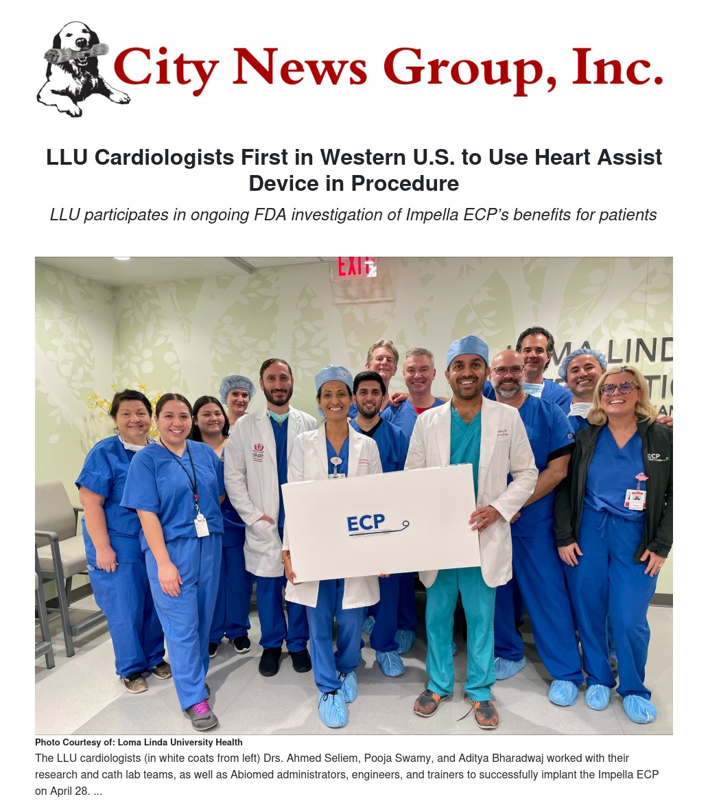 Loma Linda University International Heart Institute has become the first center in the western United States to utilize a heart assist device, Impella ECP, to support patients during high-risk percutaneous coronary intervention (PCI) procedures. LLU’s heart care team is partaking in the Impella ECP Pivotal Trial by the Food and Drug Administration (FDA), which investigates the safety and efficacy of Abiomed’s percutaneous left ventricular assist device for high-risk PCI procedures.