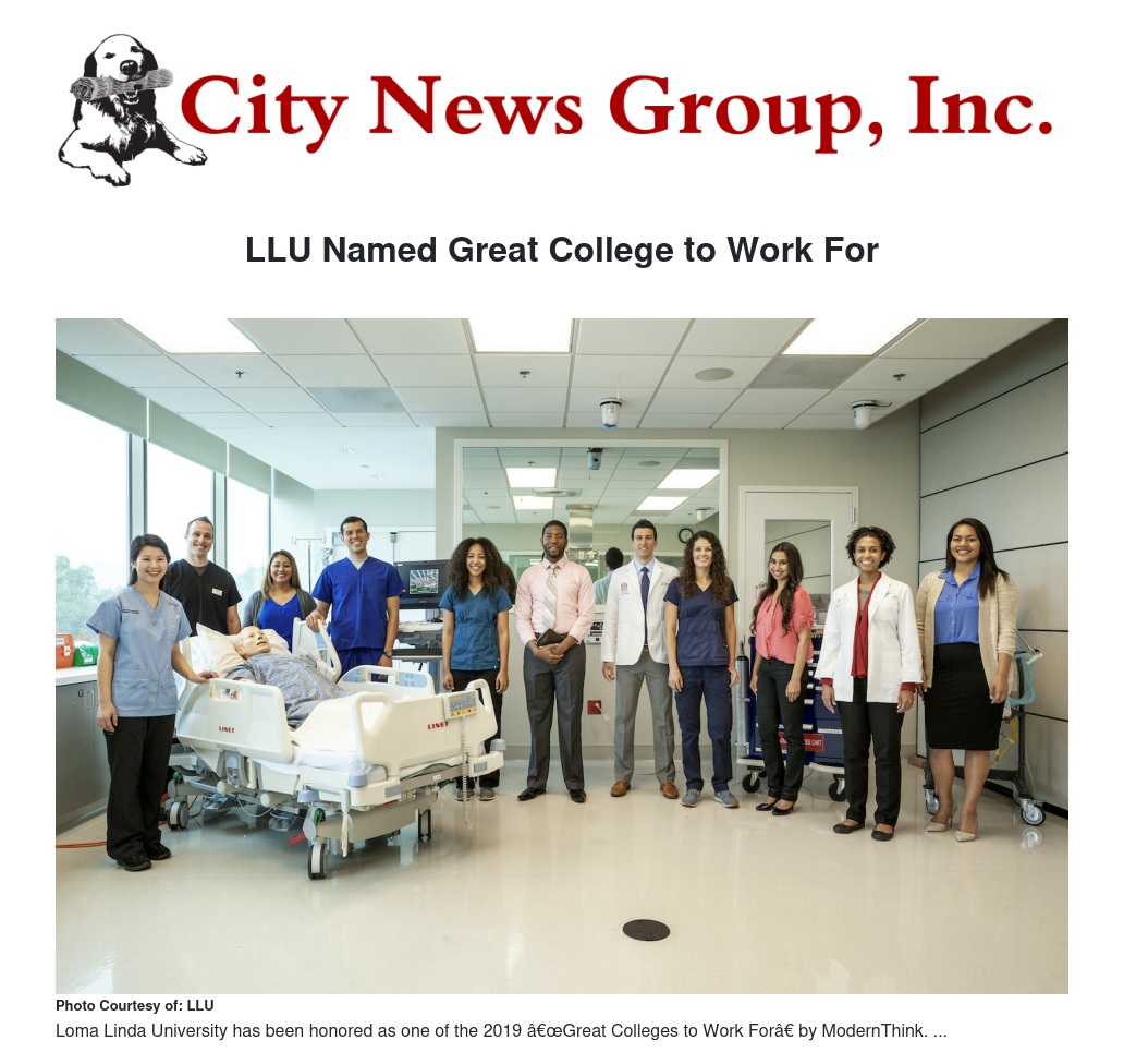 Loma Linda University has been recognized as one of the 2019 “Great Colleges to Work For” and as an Honor Roll Institution, according to a new survey by “The Great Colleges to Work For” program led by ModernThink. Released today in a special insert of The Chronicle of Higher Education, this recognition places the university among the top places to work in the nation.