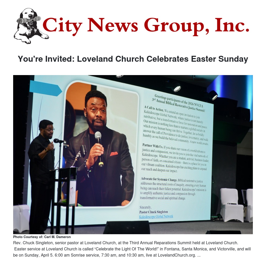 Easter service at Loveland Church is called “Celebrate the Light Of The World!” in Fontana, Santa Monica, and Victorville, and will be on Sunday, April 5. 6:00 am Sonrise service, 7:30 am, and 10:30 am, live at LovelandChurch.org. There will be a special Santa Monica service on Saturday, April 4, at noon.