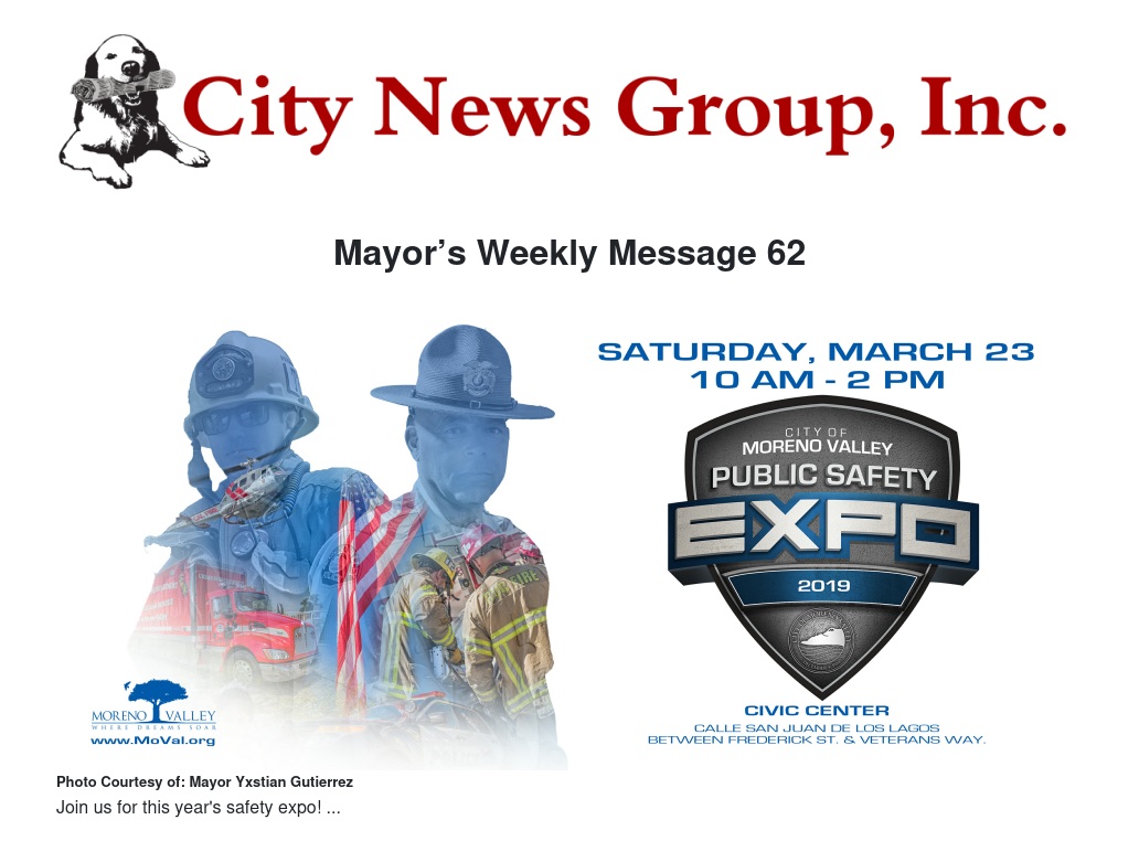 To highlight our public safety efforts, we are hosting the FREE Moreno Valley Public Safety Expo on Saturday, March 23, from 10 a.m. to 2 p.m. at the Moreno Valley Civic Center located at 22850 Calle San Juan De Los Lagos.